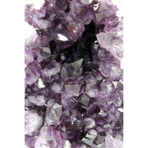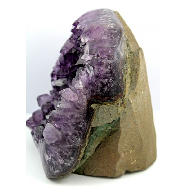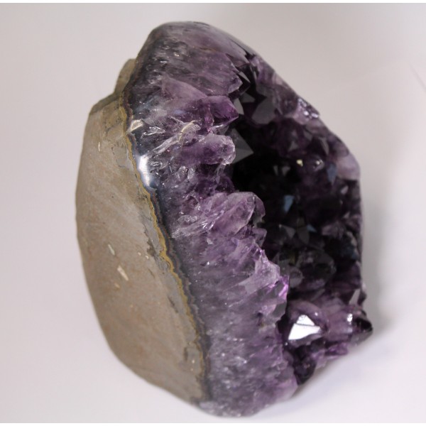 Eine Amethyst-Geode aus Brasilien als Rohstein ist ein faszinierendes Naturkunstwerk. Außen wirkt sie meist unscheinbar, rau und erdig – im Inneren jedoch offenbart sie eine funkelnde Welt aus feinen, dicht gewachsenen Kristallen. Die Geode ist von einem natürlichen Muttergestein umschlossen, häufig vulkanischen Ursprungs. Die äußere Schale zeigt dunkle braun Farbtöne und eine raue, ursprüngliche Struktur. Sie wirkt kraftvoll und naturbelassen. Von vorne zeigt sich ein atemberaubendes Kristallbett aus unzähligen feinen Amethystspitzen und feinem Bergkristall. Diese schimmern in intensiven Violetttönen, teilweise mit einem fast leuchtenden Effekt, wenn Licht auf sie trifft. Besonders bei hochwertigen Stücken entsteht ein lebendiges Farbspiel zwischen kräftigem Purpur und leuchtendem Pink. Die feinen Kristalle sind dicht an dicht gewachsen und bilden eine glitzernde Oberfläche. Jede einzelne Spitze ist klar definiert und läuft in einer sechseckigen Struktur aus – typisch für Amethyst als Varietät von Quarz. Eine Amethyst-Geode im Mutterstein wirkt besonders kraftvoll, da sie Erdende Energie (durch das Gestein) und hohe Schwingung (durch die Kristalle). Der Amethyst hat besonders reinigende Fähigkeiten für den Geist, fördert die Intuition und Kreativität, wirkt allgemein beruhigend und kann bei der Linderung von Kopfschmerzen helfen. Der Amethyst ist nicht nur schön, sondern auch ein mächtiges Werkzeug für Intuition und geistige Klarheit. Seine Energie steigert die mentale Wachheit, fördert die spirituelle Sensibilität und regt Kreativität und Inspiration an. Seine Energie fördert Konzentration, innere Ruhe und Achtsamkeit, und stärkt die Verbindung zur spirituellen Welt. Die Wirkung des Amethysts ist mehr als nur äußerliche Schönheit. Er gleicht Chakren aus, fördert Energiefluss und bringt Balance. Der Amethyst ist ein Aufladestein, ideal um Schmuck darin aufzuladen.