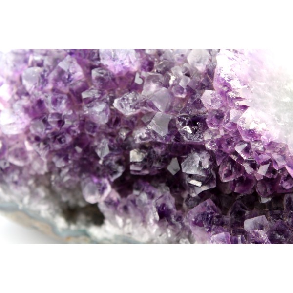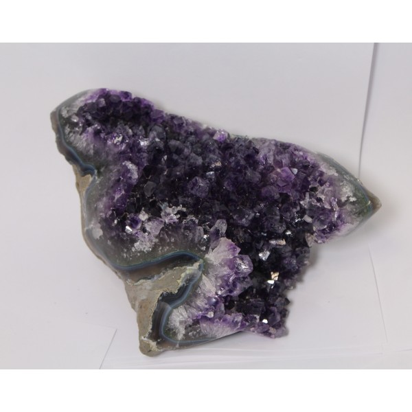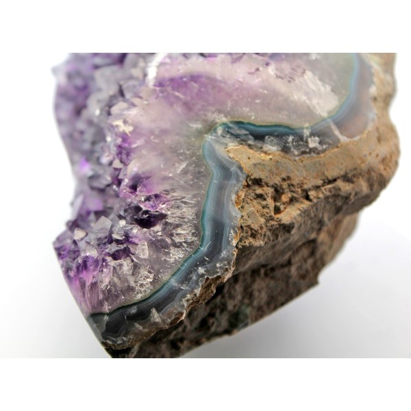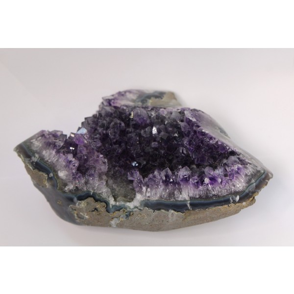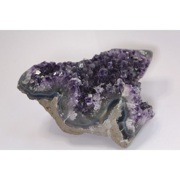 Eine Amethyst-Geode aus Uruguay als Rohstein ist ein faszinierendes Naturkunstwerk. Die äußere Schicht der Geode besteht aus erdigem Muttergestein und Achat, einer gebänderten Varietät des Chalcedons. Charakteristisch sind die sanft geschwungenen Bänderungen in Weiß-, Grau- und teilweise leicht bräunlichen Nuancen. Die Achat-Hülle bildet einen schützenden Mantel um das kristalline Innere – wie eine natürliche Umarmung der inneren Schönheit. Diese Schale symbolisiert Schutz, Erdung und Stabilität. Sie steht dafür, dass wahre Schönheit oft im Inneren verborgen liegt. Von vorne zeigt sich ein atemberaubendes Kristallbett aus unzähligen feinen Amethystspitzen und feinem Bergkristall. Diese schimmern in intensiven Violetttönen, teilweise mit einem fast leuchtenden Effekt, wenn Licht auf sie trifft. Besonders bei hochwertigen Stücken entsteht ein lebendiges Farbspiel zwischen kräftigem Purpur und leuchtendem Pink. Die feinen Kristalle sind dicht an dicht gewachsen und bilden eine glitzernde Oberfläche. Jede einzelne Spitze ist klar definiert und läuft in einer sechseckigen Struktur aus – typisch für Amethyst als Varietät von Quarz. Eine Amethyst-Geode im Mutterstein wirkt besonders kraftvoll, da sie Erdende Energie (durch das Gestein) und hohe Schwingung (durch die Kristalle). Der Amethyst hat besonders reinigende Fähigkeiten für den Geist, fördert die Intuition und Kreativität, wirkt allgemein beruhigend und kann bei der Linderung von Kopfschmerzen helfen. Der Amethyst ist nicht nur schön, sondern auch ein mächtiges Werkzeug für Intuition und geistige Klarheit. Seine Energie steigert die mentale Wachheit, fördert die spirituelle Sensibilität und regt Kreativität und Inspiration an. Seine Energie fördert Konzentration, innere Ruhe und Achtsamkeit, und stärkt die Verbindung zur spirituellen Welt. Die Wirkung des Amethysts ist mehr als nur äußerliche Schönheit. Er gleicht Chakren aus, fördert Energiefluss und bringt Balance. Der Amethyst ist ein Aufladestein, ideal um Schmuck darin aufzuladen. Diese Geode vereint Schutz (Achat), spirituelle Tiefe (Amethyst) und Klarheit (Bergkristall) in einem einzigen Naturgebilde.