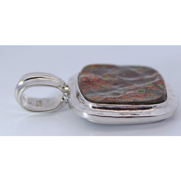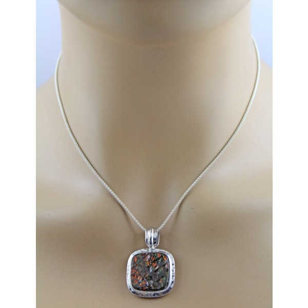 Edler Anhänger aus 925er Silber, besetzt mit einem faszinierenden Ammolit im quadratischen Schliff. Der Edelstein zeigt ein intensives, natürliches farbspiel aus Grün, Rot, Gold und Ros ...