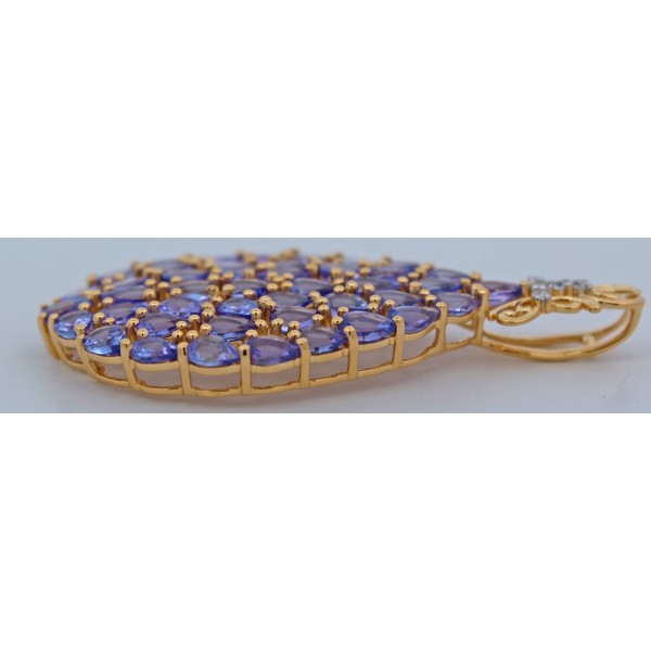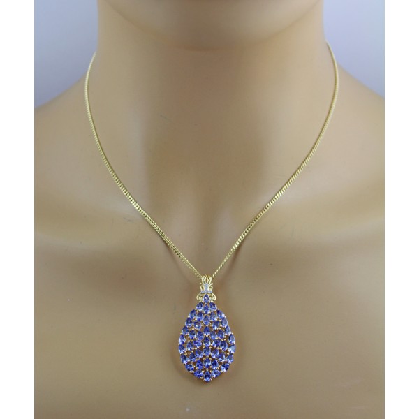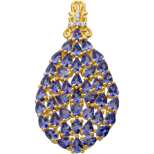 Dieser opulente Anhänger vereint elegante Farbnuancen mit einem luxuriösen Design und wird so zu einem ausdrucksstarken Schmuckstück mit besonderer Ausstrahlung. Gefertigt aus hochwertigem Silber und veredelt mit einer 1 Mikron starken Vergoldung, überzeugt der Anhänger durch seinen warmen, edlen Glanz und eine langlebige Oberflächenqualität. Im Mittelpunkt des Designs steht ein kunstvoll ausgearbeitetes Tropfenmotiv, das durch insgesamt 44 unbehandelte Tansanite von ca. 5,4ct. im Tropfenschliff veredelt wird. Die natürlich belassenen Edelsteine faszinieren mit ihrem charakteristischen, changierenden Blau-Violett und verleihen dem Anhänger eine außergewöhnliche Tiefe und lebendige Brillanz. Die präzise Anordnung der Tansanite unterstreicht die fließende Form des Designs und sorgt für ein harmonisches Gesamtbild. An der Öse setzen vier weiße Zirkonia, die klassisch in Krappen gefasst sind, funkelnde Akzente. Ihr klares, brillantes Strahlen bildet einen eleganten Kontrast zu den farbintensiven Tansaniten und hebt den Anhänger zusätzlich hervor. Gleichzeitig sorgen die Krappenfassungen für sicheren Halt und eine optimale Lichtreflexion der Steine. Das opulente Tropfen-Design verleiht dem Schmuckstück eine feminine, ausdrucksstarke Note und macht es sowohl zu einem stilvollen Blickfang im Alltag als auch zu einem perfekten Begleiter für besondere Anlässe. Die Breite liegt bei 22,7mm, bei einer Länge von 45mm, einer Höhe von 5,1mm und einem Gewicht von ca. 4,85 Gramm. Die Öse für eine Kette besitzt das Maß 8x2,6mm.