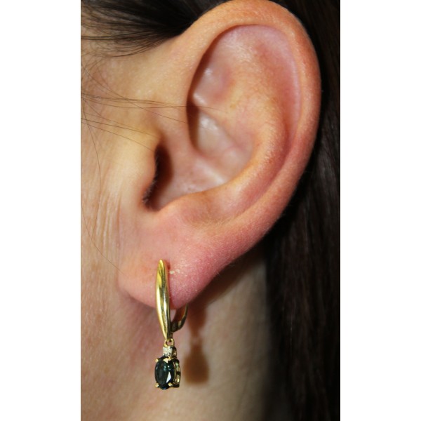 Diese edlen Edelstein Ohrringe/ Ohrhänger aus feinem 585er Gelbgold (Gold 14 Karat) vereinen klassische Eleganz mit funkelnder Raffinesse. Das Design lebt von der spannenden Verbindung zwischen moderner Edelsteinform und klassischer Eleganz- perfekt für anspruchsvolle Trägerinnen mit Sinn für dezente Luxusmomente. Im Zentrum des Ohrschmucks sitzt je ein strahlend schöner, karibischem Meeresblau strahlender, natürlicher London Blue Topas Edelstein im feinsten facettiertem Ovalschliff, der das Licht lebendig reflektiert mit einem Edelsteingewicht von zusammen ca. 1,10ct. Die 2 natürlichen London Blue Topas Edelsteine harmonieren wunderschön mit dem Glanz des Goldes. Die feinen Krappenfassungen in 14 Karat Gold, welche die klare Form der Edelsteine betonen und zugleich sicheren Halt geben. Oberhalb der feinen Topas Edelsteine wurden insgesamt 2 Diamanten im klassischen Achtkantschliff in 14 Karat Weißgold Krappen gefasst mit einem Diamant Totalgewicht von 0,05ct. in der Diamantqualität F/SI. Die Ohrhänger wurden in folgenden Maßen geschmiedet: Einer Länge von 25,1mm, einer Breite von 4,1x2,7mm, bei einer Stärke von 3,7mm und einem Gesamtgewicht von ca. 2,80 Gramm.
