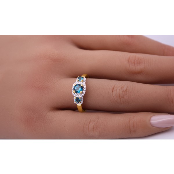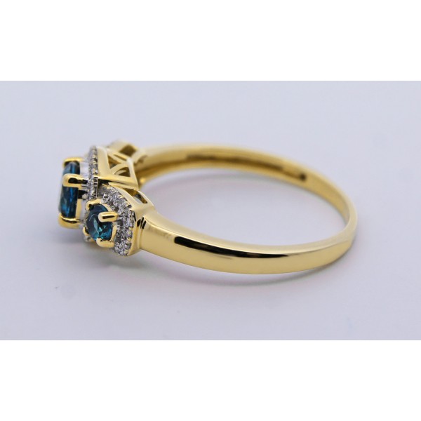 Dieser elegante Ring aus 585 Gold (14 Karat) besticht durch seine edle Farbkomposition und exzellente Verarbeitung. Im Mittelpunkt des Designs stehen 3 London Blautopase mit einem Gesamtgewicht von ca. 0,60ct. Die Edelsteine sind rund facettiert geschliffen und in einer klassischen Krappenfassung gefasst, die ihre intensive, tiefblaue Farbe sowie ihr lebendiges Funkeln optimal zur Geltung bringt. Ergänzt wird das Design durch 46 natürliche Diamanten mit einem Gesamtgewicht von ca. 0,15ct. Die Diamanten sind im Brillantschliff gearbeitet und weisen die Qualität FI/SI2 auf. Sie sind sorgfältig in Weißgold Krappen gefasst, wodurch ein strahlender Kontrast zu den London Blue Topaz entsteht und dem Ring eine luxuriöse, funkelnde Ausstrahlung verliehen wird. Die Kombination aus warmen 585 Gold, tiefblauen Topasen und leuchtenden Diamanten macht diesen Ring zu einem zeitlosen Schmuckstück, das Eleganz, Wertigkeit und modernes Design harmonisch vereint. Der Diamant Klassiker ist in schöner Goldschmiede Handarbeit geschmiedet worden mit einer Ringkopfbreite von 7,5mm, einer Höhe von 6,2mm, einer Ringschienenstärke von 0,9mm und einem Gesamtgewicht von ca. 3gr. Das Goldschmiede Schmuckstück ist bei uns in folgenden Ringgrößen verfügbar: 17-20mm.