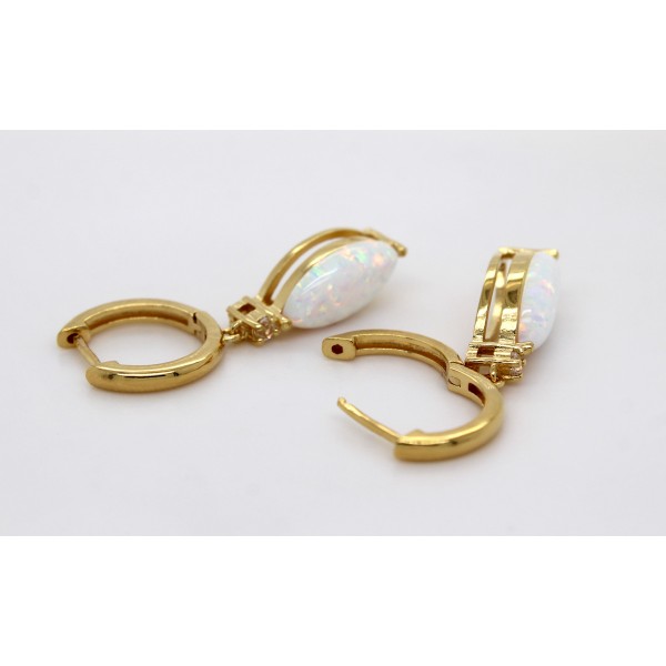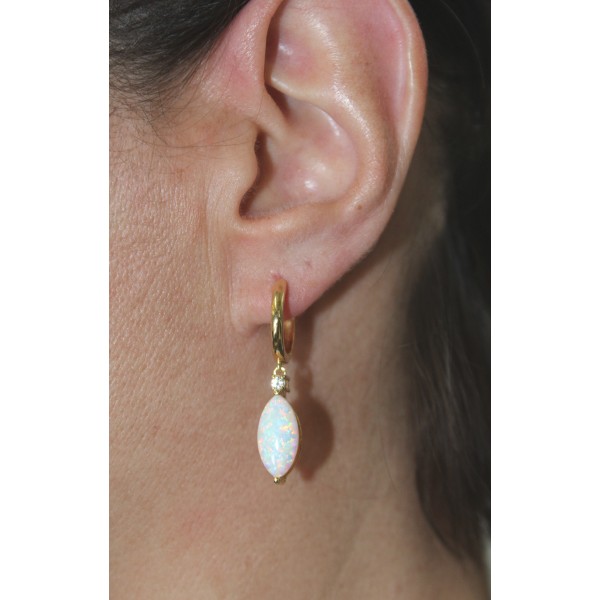 Diese traumhaften Creolen vereinen zeitlose Eleganz mit lebendiger Leichtigkeit. Gefertigt aus feinem Silber 925 und veredelt mit einer 1 Mikron starken Vergoldung, präsentieren sich diese Ohrringe in einem warmen, edlen Goldton. An jeder Creole hängt ein fein geschliffener Labor gezüchteter Opal von 4,0ct. im Navette Schliff, der durch seine längliche, spitze Form an einen Blatt oder Flamme erinnert. Der Labor Edelstein zeigt das charakteristische Farbspiel aus irisierenden Farbtönen von Blau, Grün, Orange und Weiß, welche je nach Lichteinfall über der Oberfläche tanzen. Die Krappenfassung hält den Stein sicher, wobei der schillernde Effekt besonders zur Geltung kommt. Direkt darüber sitzt je ein weißer, runder natürlicher Topas von ca. 0,15ct., ebenfalls in Krappen gefasst. Dieser klare, funkelnde Edelstein setzt einen dezenten Glanzakzent und unterstreicht dessen Farbspiel. In präziser Handarbeit wurden die Damenohrringe ganz edel gefertigt mit einer Länge von 34,9mm, einer Breite von 7,1mm, einer Stärke von 6,8mm und einem Gesamtgewicht von ca. 4,91 Gramm.