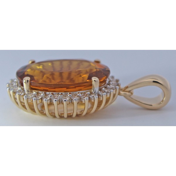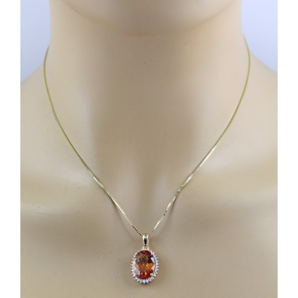 Dieser edle Anhänger aus 585er Gelbgold vereint zeitlose Eleganz mit moderner Edelsteinakzentuierung. Im Zentrum steht ein cognac brauner Natur Beryll von ca. 5,4ct. im Ovalschliff, der in einer Krappenfassung gefasst ist. Der facettenreiche Schliff verstärkt die Brillanz des Edelsteins und lässt seine Cognac-braunen, bernsteinartigen Farbnuancen besonders intensiv zur Geltung kommen. Rund um den Mittelstein funkeln 30 Labor Diamanten von ca. 0,30ct., die in Weißgold Krappen eingefasst sind und einen harmonischen Rahmen bilden. Die Kombination aus dem edlen Gold, dem warmen Beryll und den Lab Grown Diamanten macht diesen Anhänger zu einem ganz besonderen Schmuckstück. In präziser Handarbeit wurde der Damenschmuck mit einer Länge von 25,8mm, einer Breite von 13,6mm und einer Stärke von 7,1mm gefertigt. Die Ösengröße für eine Kette beträgt 3x2,3mm bei einem Gewicht von ca. 2,9 Gramm.