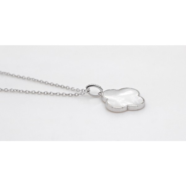 Diese filigrane Damenkette aus 925er Silber vereint zeitloses Design mit symbolischer Bedeutung. Im Mittelpunkt steht ein fein geschliffener Perlmutt von ca. 2,25ct. In verschiedenen Kulturen wurde Perlmutt als Symbol für Reinheit, Weiblichkeit und Schutz verehrt. Mit seinen schimmernden Farben und irisierenden Reflexen strahlt Perlmutt eine magische und mystische Energie aus, die in der Astrologie oft mit dem Mond in Verbindung gebracht wird. Spirituell betrachtet gilt Perlmutt als Stein der Weisheit und Intuition. Der vierblättrige Kleeblatt ist ein traditionsreiches Symbol für Glück, Hoffnung, Liebe und Vertrauen. Der Anhänger ist an einer eleganten Öse befestigt, die mit funkelnden weißen Topasen von ca. 0,02ct. verziert ist, ein stilvolles Detail, das dem Damenschmuck zusätzlichen Glanz verleiht. Die Topase sind im facettierten Schliff gearbeitet und in Krappen gefasst, was für eine starke Leuchtkraft bei jeder Bewegung sorgt. Der Edelsteinanhänger ist abnehmbar und kann mit anderen Silberketten oder Seidenbändern getragen werden. Ein ideales Geschenk für besondere Anlässe, Geburtstage oder Jubiläumsfeier. Die Edelsteinkette wird mit einem Karabiner verschlossen, bei einer Länge von 43cm. Mit einer intergrierten Verlängerungskette lässt sich das Collier um weitere 4cm verlängern. Die Breite des Anhängers beträgt 16mm, bei einer Länge von 22,4mm und einer Stärke von 2mm. Die Öse für eine Kette beträgt 4,1x1,1mm. Das Gesamtgewicht der Silberkette liegt bei ca. 2,7 Gramm.