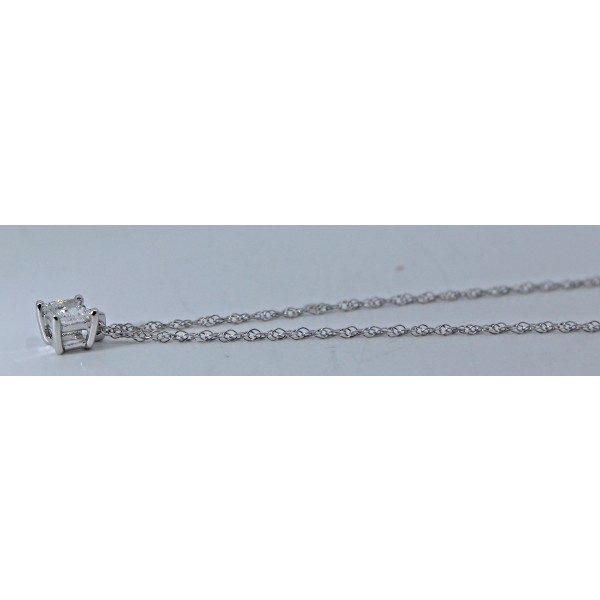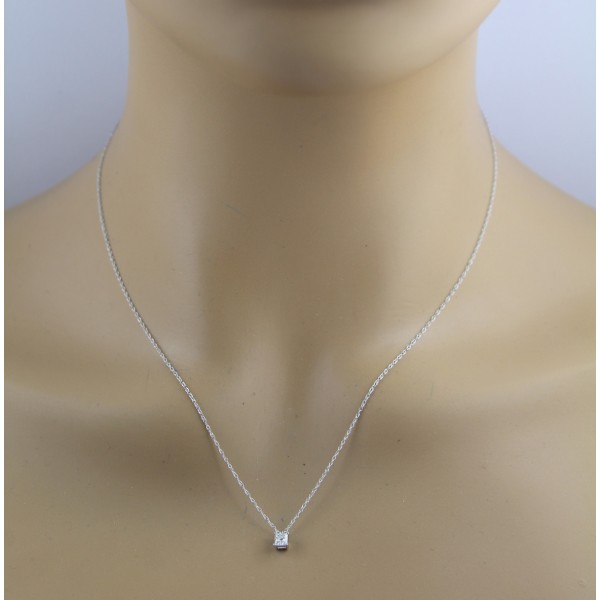 Wunderschönes Diamant Collier mit einem Solitär Anhänger aus Weißgold 585 (entspricht Gold 14 Karat) mit 1 strahlenden im Labor gezüchteten Diamanten im Princess Cut mit einem Gewicht von 0,25ct. in der Qualität F/VS (F= farblos/VS= kleine Einschlüße, welche man nur unter einer Hochpräzisionslupe vom Fachmann zu sehen sind). Der Edelsteinfasser fasste den Labor Diamanten in höchster Präzision in sichere Krappenfassungen ein. Laborgezüchtete Diamanten sind identisch zu Minen Diamanten, bieten aber Vielzahl von Vorteilen. Eine neue Generation von Diamanten, die in ihrer Schönheit und Perfektion der Natur im nichts nahestehen. Das CVD-Verfahren beginnt mit einem Diamantsamenkristall, der in eine spezielle Vakuumkammer gebracht wird. Das HP HT Verfahren High Temperature/High Pressure, dort entstehen die Steine unter hoher Temperatur und hohem Druck. Zusammen mit kohlenstoffhaltigen Gasen wachsen Atom für Atom Diamanten heran. Der Anhänger besitzt eine Breite von 4mm, eine Stärke von 3,2mm, Kettenbreite liegt bei 0,7mm bei einem Gesamtgewicht von 0,80 Gramm.