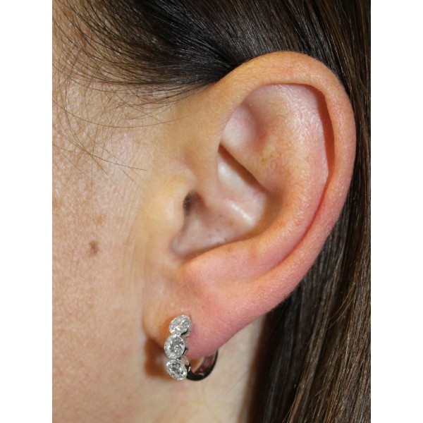 Diese klassischen Creolen aus 585er Weißgold (14 Karat) überzeugen durch ihr modernes Design und ihre hochwertige Verarbeitung. Jede Creole ist mit drei Labor Diamanten im Brillantschliff von 2,0ct. besetzt, die durch die nahtlose Fassung zu einer flächigen, funkelnden Einheit verschmelzen. Dieses besondere Fassungsverfahren lässt die Steine ohne sichtbare Metallränder erscheinen- so entsteht der Eindruck eines einzigen, größeren Diamantfeldes. Die Diamant Creolen wurden mir einer Klappscharnier Schließe ausgestattet, was das An und Ablegen erleichtert. Eine neue Generation von Diamanten, die in ihrer Schönheit und Perfektion der Natur im nichts nahestehen. Das CVD-Verfahren beginnt mit einem Diamansamenkristall, der in eine spezielle Vakuumkammer gebracht wird. Das HP HT Verfahren High Temperature/High Pressure, dort entstehen die Steine unter hoher Temperatur und hohem Druck. Zusammen mit kohlenstoffhaltigen Gasen wachsen Atom für Atom Diamanten heran. Die Diamantohrringe besitzen eine Stärke von 1,5-3,2mm, eine Breite von 2-4,4mm, einen Durchmesser von 14,5mm, einer Länge von 13,5mm und einem Gesamtgewicht von ca. 2,74 Gramm.