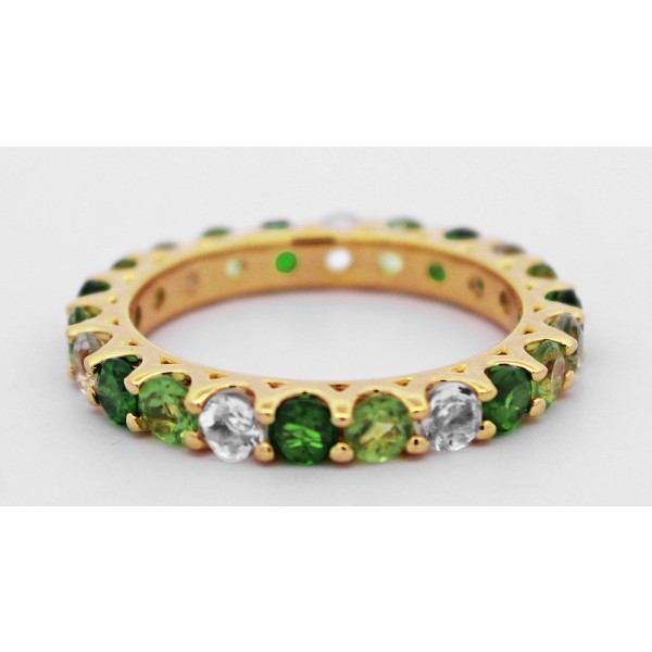 Dieser außergewöhnliche Memoire-Ring verbindet zeitlose Eleganz mit farbenfroher Naturkraft. Gefertigt aus hochwertigem Silber Sterlingsilber und mit einer feinen 1-Mikron-Vergoldung, besticht er durch seine warme, luxuriöse Ausstrahlung und sorgt für langanhaltenden Glanz. Die edelsteinbesetzte Fassung zeigt eine harmonische Komposition aus drei strahlenden, unbehandelten Steinen. Grüner Amethyst – verleiht dem Ring Tiefe und mystische Eleganz mit sanften, klaren Grün-Tönen, Peridot – bringt frische, lebendige Akzente und steht für Vitalität und Lebensfreude, Chromdiopsid – ein seltener, intensiver Grünstein, der den Ring zu einem echten Blickfang macht. Jeder Stein ist komplett in Krappen gefasst, was ihre natürliche Schönheit optimal zur Geltung bringt und gleichzeitig sicheren Halt garantiert. Diese präzise Verarbeitung unterstreicht die feine Handwerkskunst und sorgt für eine elegante, moderne Silhouette. Der Memoire-Ring ist nicht nur ein Schmuckstück, sondern ein persönliches Statement: Er eignet sich ideal, um besondere Momente oder Erinnerungen zu symbolisieren, und wird zum treuen Begleiter für jeden Tag oder besondere Anlässe. Die Ringkopfbreite beträgt 3,2mm, bei einer Höhe von 3,2mm und einem Gewicht von ca. 3,0 Gramm. Der Ring ist bei uns in folgenden Größen ab Lager erhältlich: 17-20mm