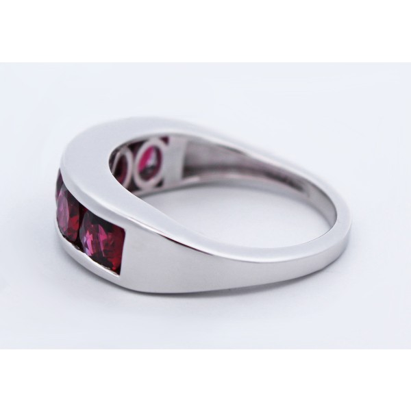 Eleganz trifft auf zeitlose Symbolik: Dieser exklusive Memoire-Ring ist aus hochwertigem 925er Silber Sterlingsilber gefertigt und sorgfältig rhodiniert, wodurch der Ring eine strahlend glänzende Oberfläche erhält und gleichzeitig vor Anlaufen geschützt ist. Der Ring ist besetzt mit fünf natürlichen, unbehandelten roten Rhodolit Edelsteinen im klassischen Rundschliff, die in einer Kanal-Fassung sicher und gleichmäßig nebeneinander angeordnet sind. Die kühle Farbe der Rhodolite verleiht dem Ring eine mystische Ausstrahlung und setzt einen subtilen, dennoch ausdrucksstarken Farbakzent. Die Kanal-Fassung betont die Klarheit und Brillanz der Steine, während sie gleichzeitig einen eleganten, glatten Ringverlauf garantiert – ideal für den täglichen Tragekomfort. Jeder Stein symbolisiert einen besonderen Moment oder ein wichtiges Lebensereignis, wodurch der Ring seine Funktion als Memoire-Schmuckstück perfekt erfüllt. Ob als Geschenk zu einem Jubiläum, Geburtstag oder als persönliche Erinnerung – dieser Ring verbindet edle Materialien, handwerkliche Präzision und zeitlose Eleganz in einem stilvollen Schmuckstück, das Generationen überdauert. Der Memoire Ring wurde in folgenden Maßen gefertigt: Die Ringkopfbreite beträgt 6,5mm, bei einer Ringkopf Höhe von 4mm, einer Stärke von 1,6mm und einem Gewicht von ca. 4,6 Gramm. Der Ring ist bei uns in folgenden Größen ab Lager erhältlich: 17-20mm.