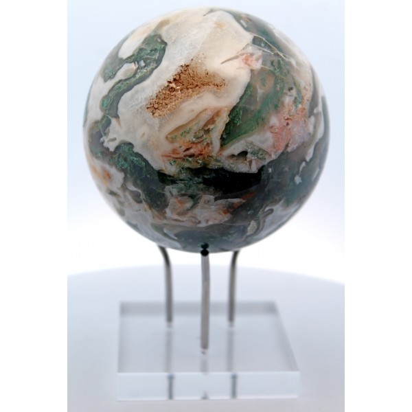 Diese außergewöhnliche handgeschnitzte Moosachat-Kugel stammt aus einem sorgfältig ausgewählten Rohstein und überzeugt durch ihre Top AAA Qualität. Durch die hochglanzpolierte Oberfläche entfaltet der Edelstein seine charakteristischen Adern besonders eindrucksvoll und verleiht der Kugel eine edle, mystische Ausstrahlung. Die Grundfarbe zeigt ein tiefes, natürliches Moosgrün, das an Waldboden, frisches Blattwerk oder feuchte Wiesen erinnert. Dieses Grün ist nicht gleichmäßig, sondern lebendig strukturiert – mal wolkig, mal in feinen, pflanzenähnlichen Einschlüssen, die typisch für Moosachat sind. Zwischen den grünen Partien erscheinen beige bis cremefarbene Bereiche, weich und beruhigend, wie Licht, das durch Baumkronen fällt. Diese helleren Zonen bringen Leichtigkeit in den Stein und lassen die grünen Einschlüsse noch intensiver wirken. Besonders charakteristisch sind die rostbraunen Adern, die sich wie feine Wurzeln oder verzweigte Äderchen durch die Kugel ziehen. Sie erinnern an Erde, an Eisenoxid im Gestein, an Herbstlaub oder an die Spuren der Zeit. Moosachat wird stark mit dem Element Erde verbunden. Spirituell wird er oft Menschen empfohlen, die sich in einer Übergangsphase befinden oder alte Muster loslassen möchten. Im Gegensatz zu sehr intensiven Herzsteinen wirkt Moosachat eher ruhig, stabilisierend und nährend. In Kugelform eignet sich Moosachat besonders für für Meditationsräume und zur Harmonisierung von Wohnbereichen. Die Edelsteinkugel bringt ein stolzes Gewicht von ca. 763 Gramm auf die Waage, bei einem Kugel-Durchmesser von 81mm. Die wunderschöne Kugel wird mit einem edlen und sicheren Plexiglasständer geliefert, welcher die Schönheit des Edelsteines perfekt zur Geltung bring.