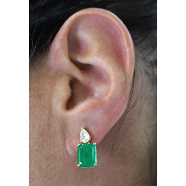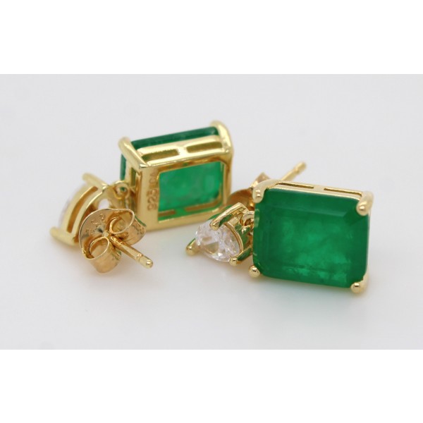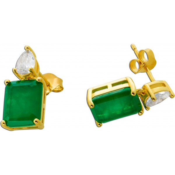 Wunderschöner und imposanter Ohrstecker in feinstem Silber 925 1 Micron Gelbgold plattiert im prächtigem Edelsteinlook mit je einem grün leuchtenden Zirkonia Stein, im echten Edelstein Look mit einem Totalgewicht von Total ca. 7,00ct. im feinsten Baguette Edelsteinschliff. Begleitet werden die Steine von 2 weißen, brillantfunkelnden Zirkonias, welche im perfekten Pear Cut (facettiertem Tropfenschliff) geschliffen wurden. Die beiden täuschend echten Zirkonia befinden sich in einer Top feinen Qualität und sind ausschließlich vom Fachmann unter einer Juwelierslupe von echten Edelsteinen zu unterscheiden, in keinem Fall mit dem bloßen Auge. Die funkelnden Steine wurden vom Edelsteinfasser perfekt und sicher in feinste Krappenfassungen in Silber 925 1 Micron Gelbgold plattiert gefasst. In präziser Handarbeit wurden die Ohrstecker ganz edel und modern gefertigt mit einer Länge von 17,6mm und einer Breite 8,3mm bei einer Stärke von 5,4mm. Das Gewicht beträgt 4,5 Gramm.
