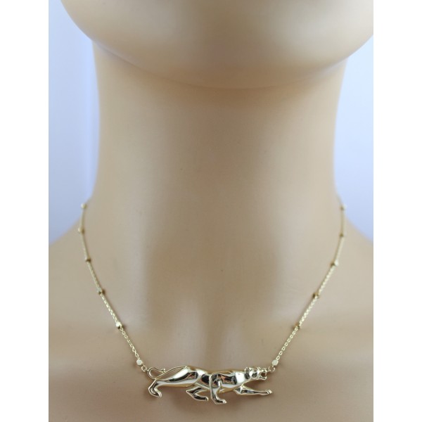 Erleben Sie zeitlose Eleganz mit dieser luxuriösen Ankerkette aus 585er Gelbgold, die durch ihre hochwertige Politur einen brillanten Glanz aufweist. Das Highlight der Kette ist ein nicht abnehmbarer, opulenter Panther-Anhänger, der in seiner Detailverliebtheit und kraftvollen Präsenz sofort ins Auge fällt. Der Panther symbolisiert Stärke, Eleganz und Selbstbewusstsein – ein Statement, das diese Kette perfekt unterstreicht. Die Kette selbst besticht durch kleine, runde, polierte Zwischenelemente, die den klassischen Ankerkettenschnitt modern aufwerten und für ein harmonisches Spiel von Licht und Bewegung sorgen. Ein sicherer Karabinerverschluss gewährleistet komfortables An- und Ablegen bei maximaler Stabilität. Dieses Schmuckstück vereint handwerkliche Präzision, luxuriöse Materialien und markantes Design – ideal für Liebhaberinnen und Liebhaber ausdrucksstarker, einzigartiger Schmuckstücke. Die Länge des Colliers beträgt: 42cm. Mit einer zusätzlichen Öse kann das Collier um 3 cm verlängert werden. Die Kette besitzt eine Breite/Stärke von 0,8mm. Der Anhänger misst eine Breite von 43mm, eine Länge von 12,4mm und eine Stärke von 3,8mm. Das Gesamtgewicht des Colliers beträgt ca. 5,0 Gramm.