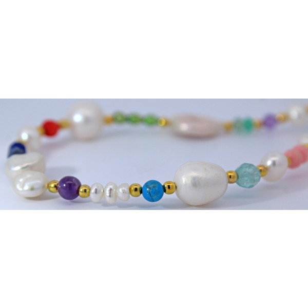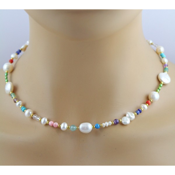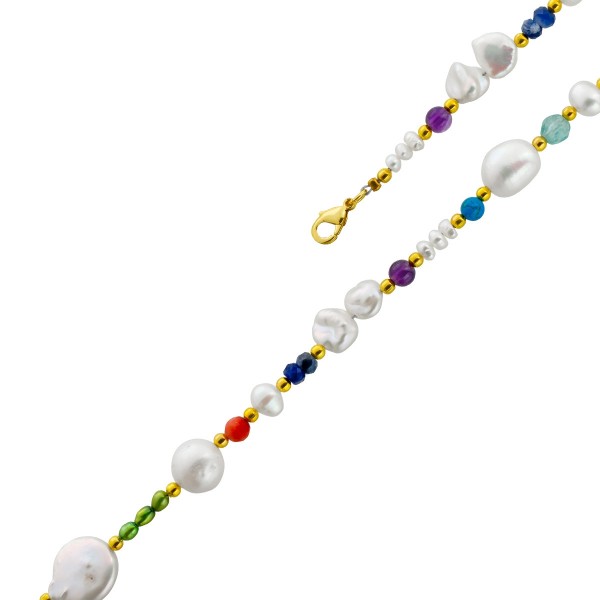 Eine elegante Perlenkette mit Edelsteinen, die durch ihre edlen Materialien und ansprechende Farbgebung besticht. Die Kette ist mit Süßwasser-Zuchtperlen in Barock und Reiskornform ausgestattet, die in einem zarten weiß-rose und grün mit sehr schönem lippigem Lüster glänzen und eine Größe von je 4-12,1mm besitzen. Ergänzt wird das Schmuckstück durch natürliche lila Amethyste, rotem Karneol, Türkisen, Bergkristalle, Lapislazuli, Fluorite und Angel Skin Koralle im rund facettierten Schliff mit einem Durchmesser von je 3,6-4,6 mm, die einen edlen Kontrast setzen. Gelbgold vergoldete Kugelzwischenteile fügen dezente, luxuriöse Akzente hinzu und runden das Design perfekt ab. Die Kette hat eine Länge von 42 cm und kann durch eine zusätzliche Verlängerungskette von 6 cm in der Tragelänge variiert werden. Dieses handgefertigte Schmuckstück vereint edle Materialien und zeitlose Eleganz – ideal für besondere Anlässe und ein Highlight für jeden Schmuckliebhaber.