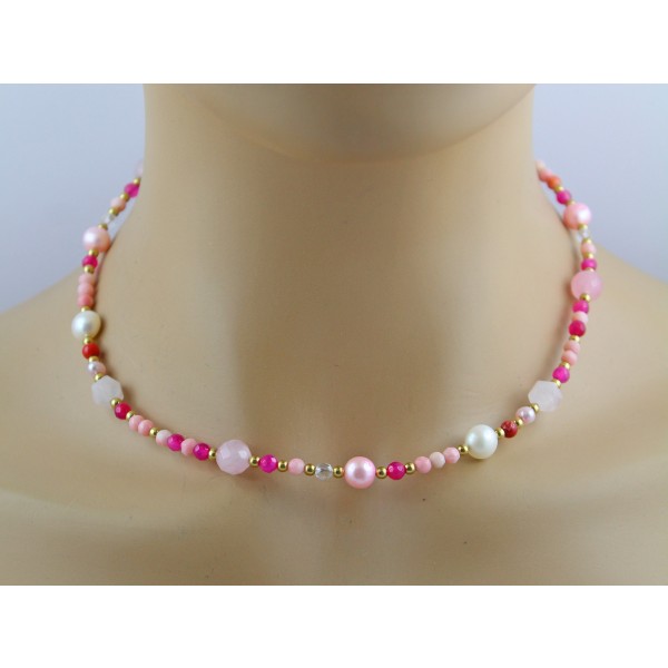 Perlenkette mit vergoldeten Zwischenelementen, die Süsswasser Perlen in weißem und pinken Perlenglanz in einem satten Goldton kombiniert, ergänzt durch pinken Natur Achat, wundersch&ou ...