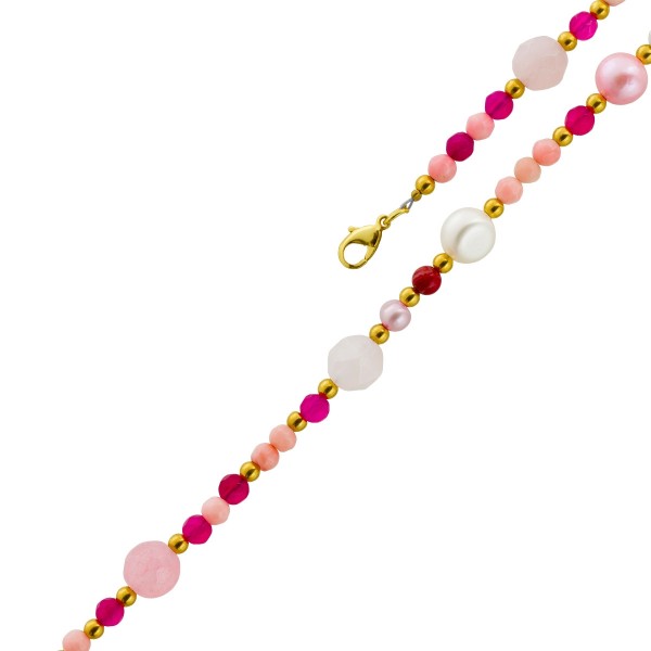 Perlenkette mit vergoldeten Zwischenelementen, die Süsswasser Perlen in weißem und pinken Perlenglanz in einem satten Goldton kombiniert, ergänzt durch pinken Natur Achat, wunderschönem Natur Rosenquarz, klarem Bergkristall und Angel Skin Korallen im facettierten Schliff, ist ein wahrer Blickfang. Die Perlen messen eine Größe von 7,2-8,2mm, Achat Edelsteine 4,2mm, Rosenquarz 8,1mm, Bergkristall 4mm und die Angel Skin Koralle 3,9mm. Rote Achat Edelsteine, die die anderen Farben harmonisch abrunden. Angel Skin Koralle verleiht dem Schmuckstück einen Hauch von Naturverbundenheit. Der rosa Rosenquarz einen Hauch von Romantik. Die Kombination aus Süsswasser Perlen und Edelsteinen macht die Kette zu einem exclusiven Schmuckstück mit einem Hauch von Modernität. Feminin, verspielt und edel, ideal für elegante oder lässige Outfits. Eine wirklich gelungene Designer- Edelsteinkette mit feinen Perlen, welche im Farbton und der Größe leicht abweichen können. Die Halskette wurde mit einem vergoldeten Karabiner und einer Verlängerungskette ausgestattet.
