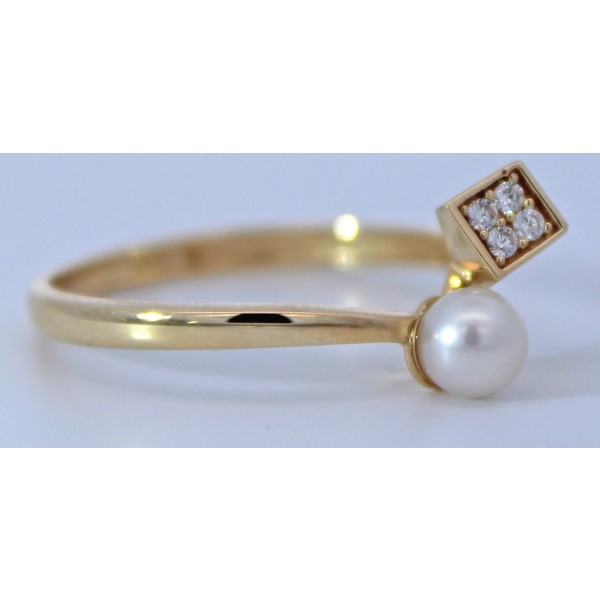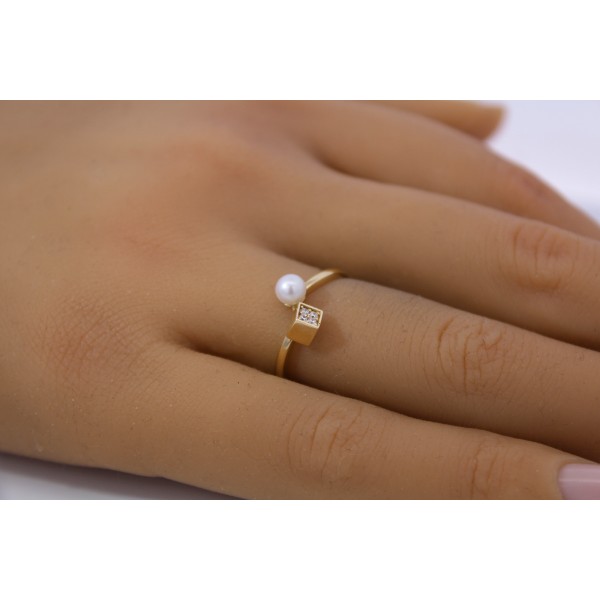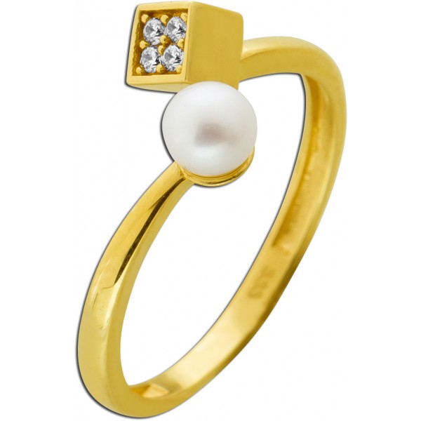 Ein Schmuckstück, das Blicke fesselt und bleibenden Eindruck hinterlässt. Dieser edle Damenring aus Gelbgold 333 (8 Karat Gold) gefertigt, vereint klassische Eleganz mit modernem Design. Die geteilte Ringschiene verläuft dynamisch und offen, an einem Ende sitzt eine edle Süßwasser Zuchtperle von 4,2mm, am anderen Ende befindet sich ein viereckiges Element, das mit 4 Zirkonia Steinene besetzt ist. Die beiden Enden der Ringschiene sind durch einen filigranen Steg verbunden, der dem Ring Stabilität verleiht und gleichzeitig das offene, moderne Design elegant abrundet. Beide Enden sind wirkungsvoll inszenierte und schaffen einen reizvollen Gegensatz zwischen dem sanften Schimmer der Perle und dem präzisen Funkeln der Zirkonia. Die Süßwasser Perle zeichnet sich durch ihren zarten Rose Lüster und ihre harmonisch runden Form aus, ein klassisches Symbol für Reinheit und Weiblichkeit. Die Ringkopfbreite liegt bei 7,5mm, bei einer Ringkopfhöhe von 5,5mm, einer Ringschienenstärke von 1mm und einem Gesamtgewicht von ca. 1,4 Gramm. Der Damenring ist bei uns in den Ringgrößen 17-20mm ab Lager erhältlich.