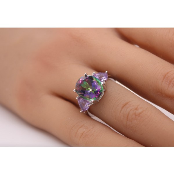 Ein Damenring aus Silber 925 der Magie versprüht. Im Mittelpunkt steht ein natürlicher Mystic Topas von ca. 8,2ct. im oval facettierten Schliff, der durch sein irisierenden Farben sofort alle Blicke auf sich zieht. Je nach Lichteinfall changiert der Stein in schillernden Tönen von Grün, Violett, Blaus bis hin zu Rosa, ein lebendiges Farbspiel, das an Polarlichter erinnert. Der Topas wird von 2 natürlichen, brasilianischen Amethysten von ca. 2,2ct. flankiert. Ihre charakteristische violette Farbe harmoniert perfekt mit den multicolour Effekten des Hauptsteins und verleiht dem Ring Tiefe und Eleganz. Die Krappenfassungen sorgen dafür, dass alle Edelsteine sicher gehalten werden und gleichzeitig maximalen Lichteinfall erhalten.Ein Schmuckstück wie ein Kaleidoskop- dieser Silberring bringt Farbe, Licht und Eleganz an ihre Hand. Der Damenschmuck wurde in folgenden Maßen geschmiedet: Die Ringkopfbreite beträgt 12,3mm, bei einer Ringkopfhöhe von 8,6mm, einer Ringschienenstärke von 1,4mm und einem Gesamtgewicht von ca. 4,41 Gramm. In unserem Online Shop wird der Ring in den Ringgrößen 17-20mm ab Lager verfügbar sein.