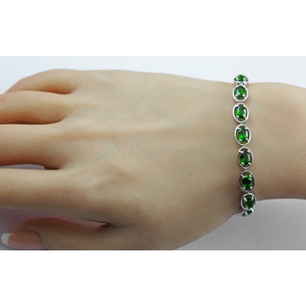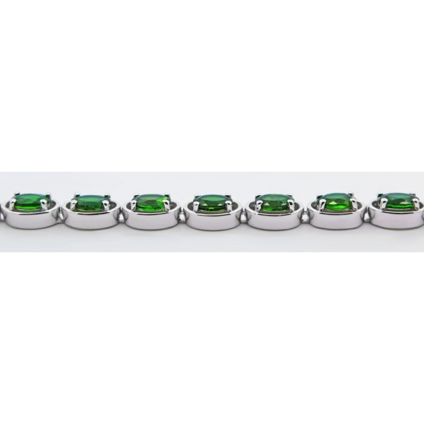 Dieses elegante Tennisarmband vereint zeitlose Ästhetik mit edler Handwerkskunst. Gefertigt aus hochwertigem Silber, veredelt durch eine rhodinierte Oberfläche, besticht das Schmuckstück durch seinen kühlen, glänzenden Schimmer sowie durch erhöhte Widerstandsfähigkeit gegen Anlaufen und Abnutzung. Im Mittelpunkt des Designs stehen unbehandelte Chromdiopsite von ca. 7,9-8,8ct., die für ihre intensive, natürlich leuchtende grüne Farbe geschätzt werden. Die Edelsteine sind im präzisen Ovalschliff gearbeitet, wodurch ihre Tiefe und Brillanz besonders wirkungsvoll zur Geltung kommen. Jeder Stein bewahrt durch den Verzicht auf jegliche Behandlung seine ursprüngliche, authentische Ausstrahlung. Die Chromdiopsite sind krappengefasst, was ihnen maximalen Lichteinfall ermöglicht und ihre natürliche Farbintensität zusätzlich unterstreicht. Umrahmt wird jeder Edelstein von einer feinen ovalen Zarge, die dem Armband Struktur verleiht, die Steine schützt und gleichzeitig einen harmonischen, eleganten Rahmen schafft. Durch die gleichmäßige Reihung der ovalen Edelsteine entsteht der charakteristische, fließende Look eines klassischen Tennisarmbands. Das Armband schmiegt sich angenehm an das Handgelenk an und bietet dank seiner sorgfältigen Verarbeitung hohen Tragekomfort. Ein sicherer Kastenverschluss und Achter sorgen für zuverlässigen Halt im Alltag wie auch zu besonderen Anlässen. Das Armband ist sehr beweglich und schmiegt sich wunderbar dem Handgelenk an. Das Damenarmband besitzt eine Breite von 6,7mm und eine Stärke von 4,3mm. Das Tennisarmband ist bei uns in folgenden Längen/Gewichte erhältlich: 18cm- 13,5 Gramm und 20cm- 15 Gramm.